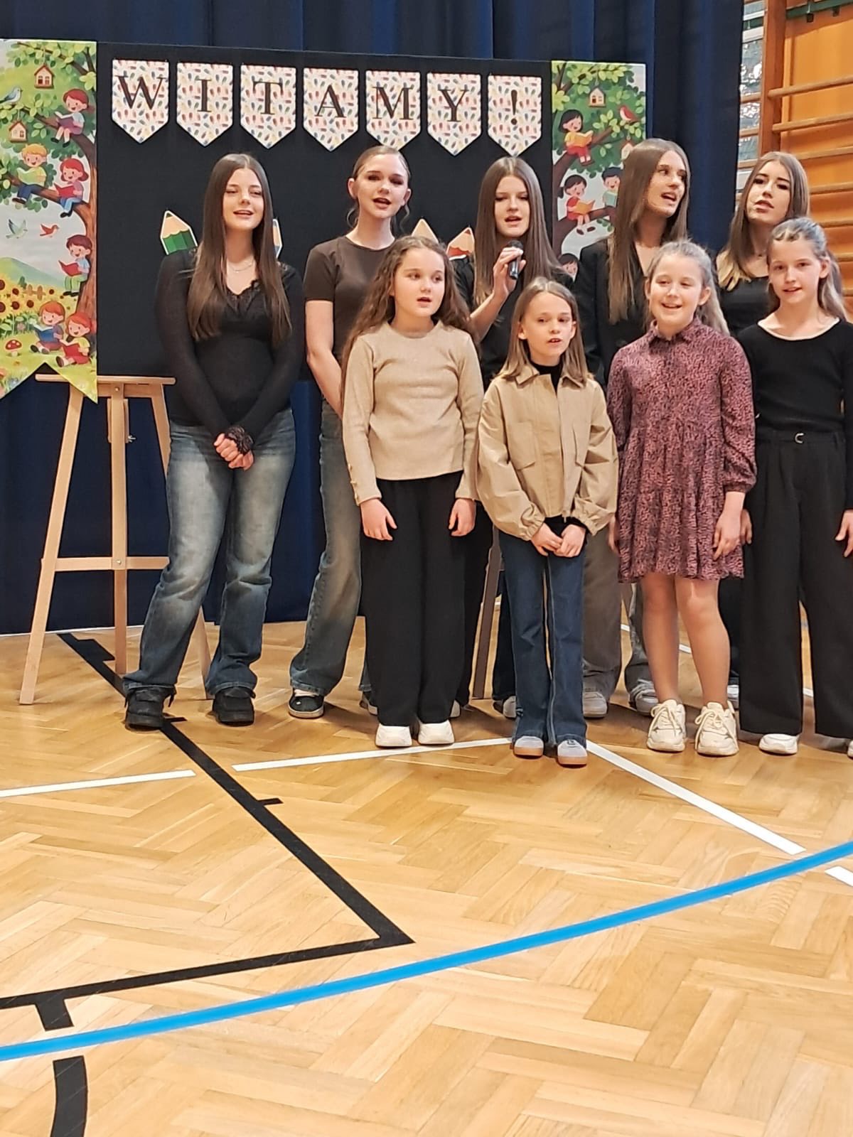 Przyszli pierwszoklasiści zostali również powitani piosenką w wykonaniu uczennic z klas III i VIII, która wprowadziła wszystkich w radosną atmosferę spotkania.