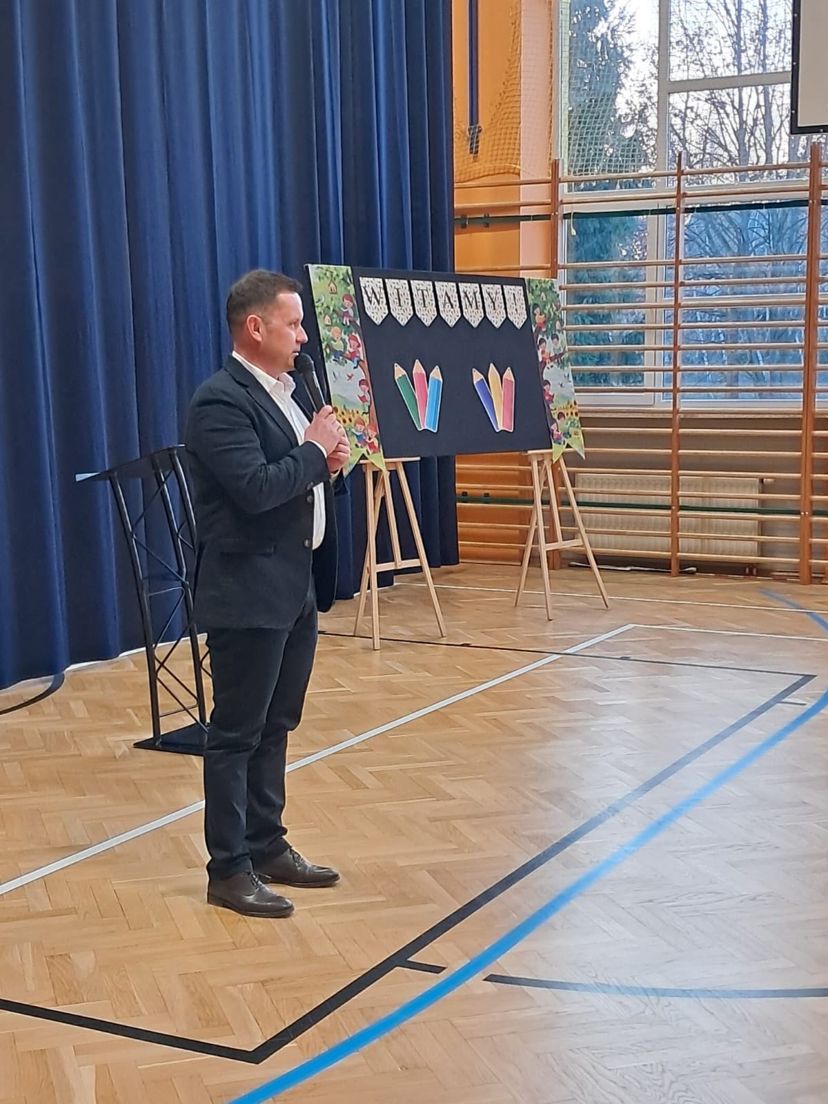 Na wstępie Pan Dyrektor serdecznie przywitał najmłodszych gości oraz ich rodziców. W swoim przemówieniu przedstawił najważniejsze atuty i walory naszej placówki, zachęcając przyszłych uczniów do rozpoczęcia tu swojej szkolnej przygody.