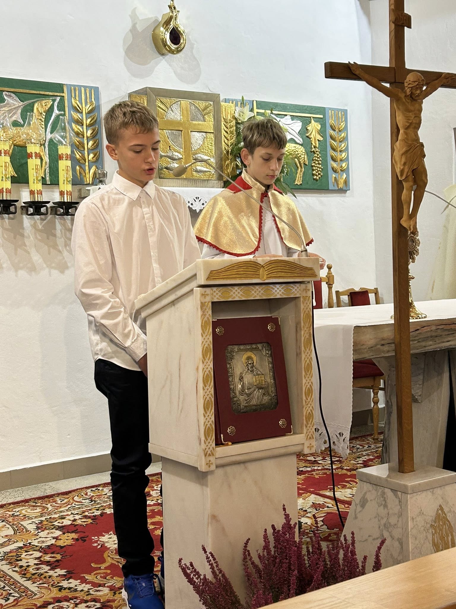 Uroczystości rozpoczęliśmy Mszą Świętą w kościele parafialnym, w której uczestniczyli uczniowie, nauczyciele oraz rodzice. Podczas Mszy św. obecny był poczet sztandarowy szkoły, a wspólny śpiew hymnu szkoły podkreślił uroczysty charakter tego wydarzenia.